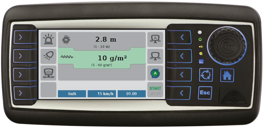 StrikeSmart™ styrenheten låter dig skräddarsy ditt spridningstillfälle enligt situation. Automatisk GPS-justering av materialflödet anpassar mängden spridningsmaterial (g/m2) enligt fordonets hastighet, medan du i manuellt läge matar in ett fast värde. Kontrollen samlar även in och sparar grundläggande data till ett USB-minne, från vilket du sedan enkelt kan skapa rapporter över dina spridningstillfällen. Via kontrollen kan du enkelt slå på funktioner som vibrator, varningsljus och arbetsljus från fordonshytten.